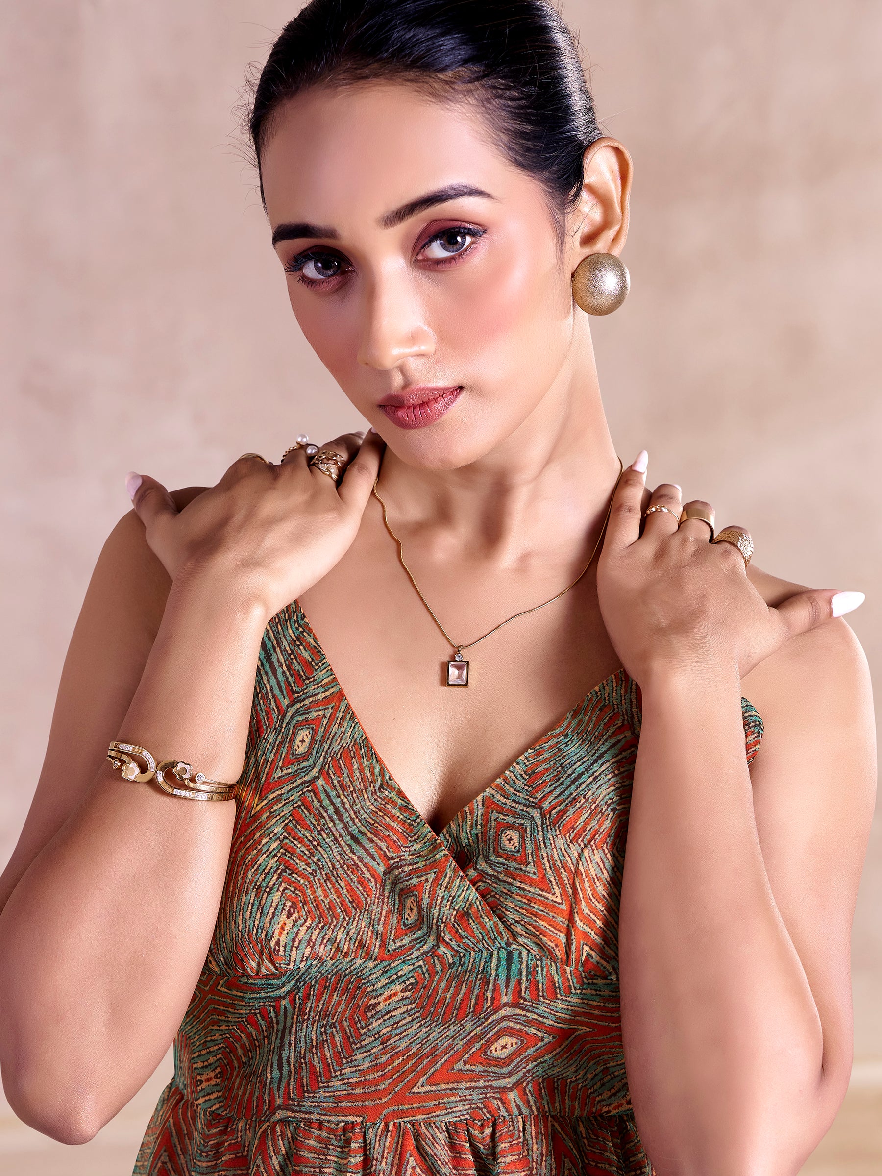 Turn heads in this Effortlessly Bohemian, Elegantly Bold breezy, boho-inspired Georgette dress featuring delicate spaghetti straps and a flattering empire waistline. The earthy terracotta and teal palette is beautifully accented by intricate tribal-inspired patterns, giving it a rich, artisanal charm. Soft pleats fall gracefully from the bust, flowing into a lightweight skirt that moves with you. Whether you’re headed to a beach brunch or a sunset soirée, this dress is your go-to.