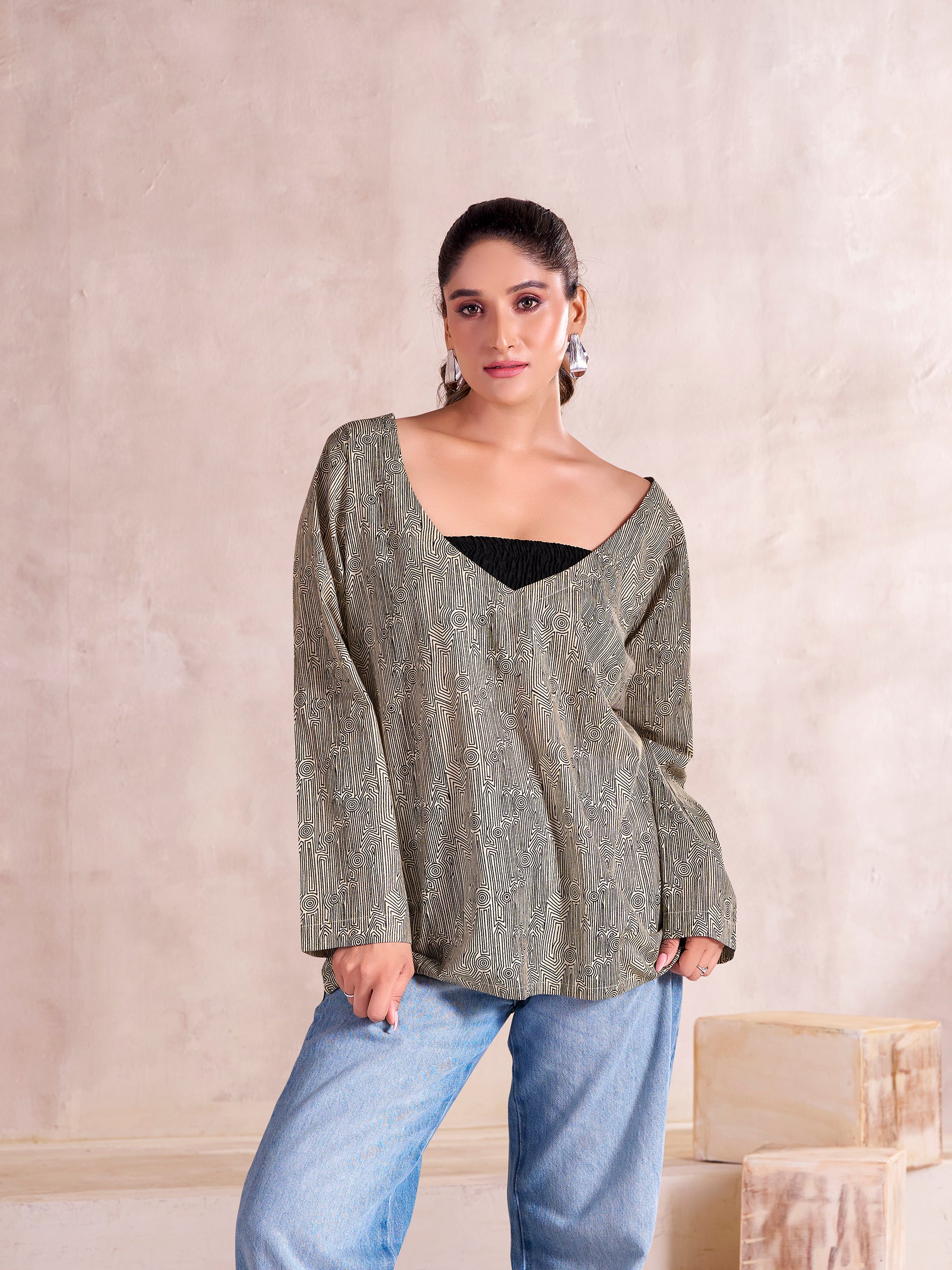 Turn heads in the Mystic Maze V-Neck top with brallete, where boho spirit meets modern edge. With its geometric maze-inspired print and daring deep V cut,