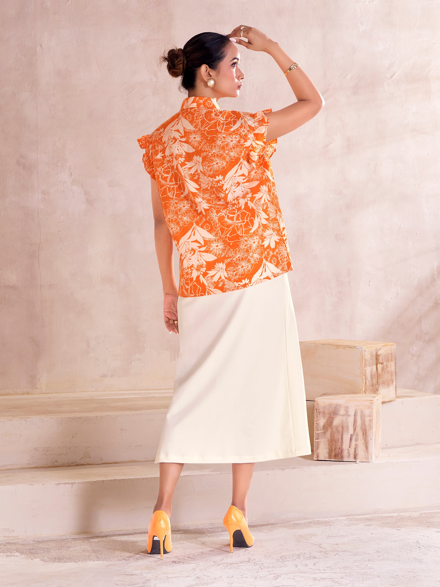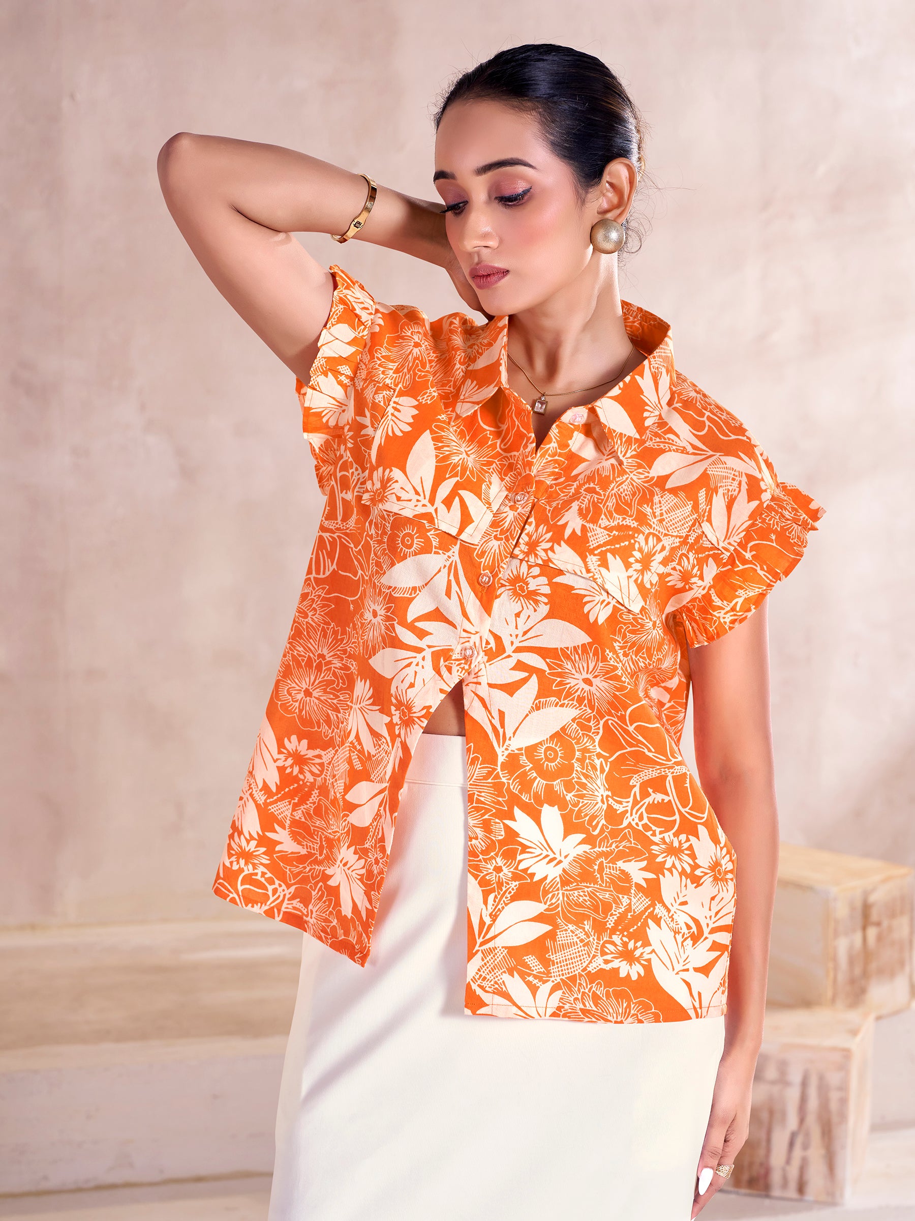 Add a touch of elegance to your day with our Tropical Bloom Button-Down Shirt for professional, polish and relaxed style. The lightweight, flowy fabric and delicate ruffle sleeves add a fresh, playful touch, while the structured collar keeps it office-appropriate. Whether you’re heading to a meeting or enjoying a weekend brunch, this look effortlessly transitions from work to casual with ease and confidence.