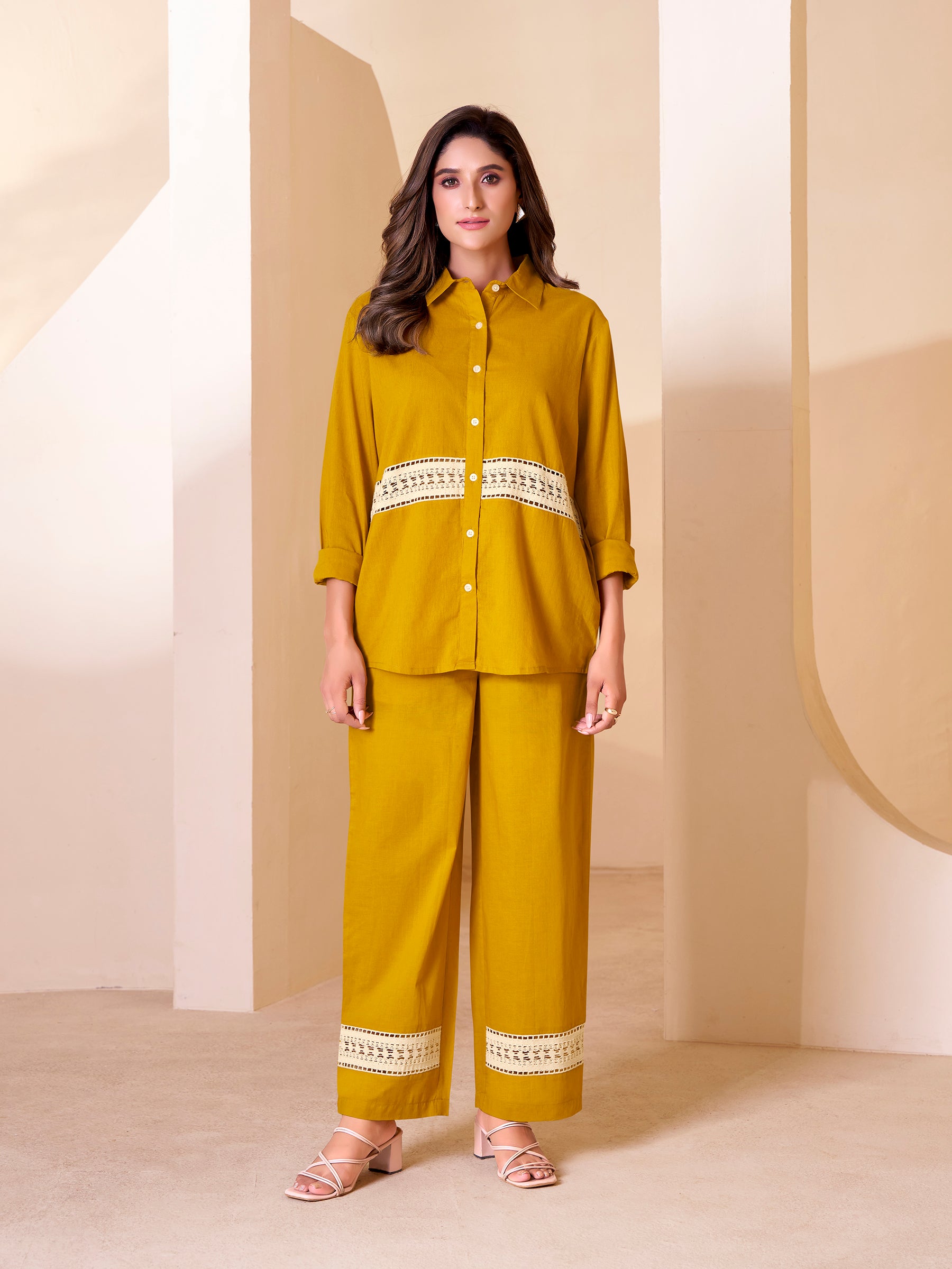 The Mustard Muse Co-ord Set is a fusion of earthy charm and modern ease. Crafted in a warm mustard tone, the button-down top features delicate white lace paneling at the waist, echoed stylishly on the pants with geometric lace accents at the hem. A perfect blend of comfort and handcrafted flair, this set brings understated elegance to everyday dressing.