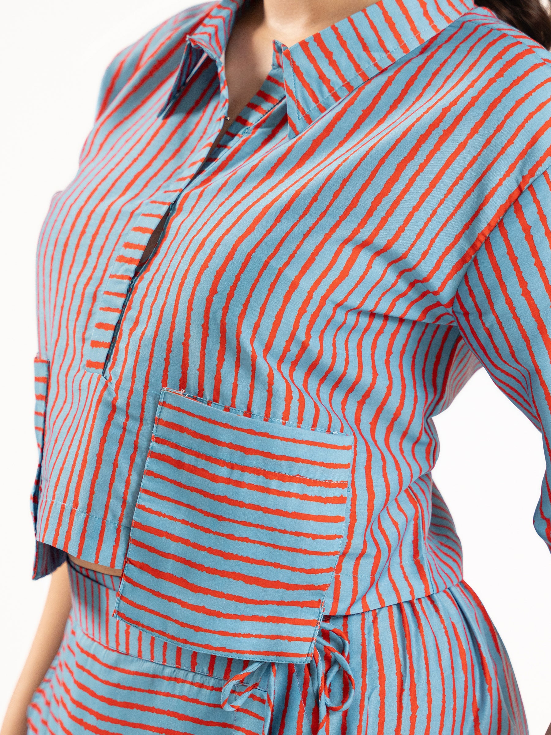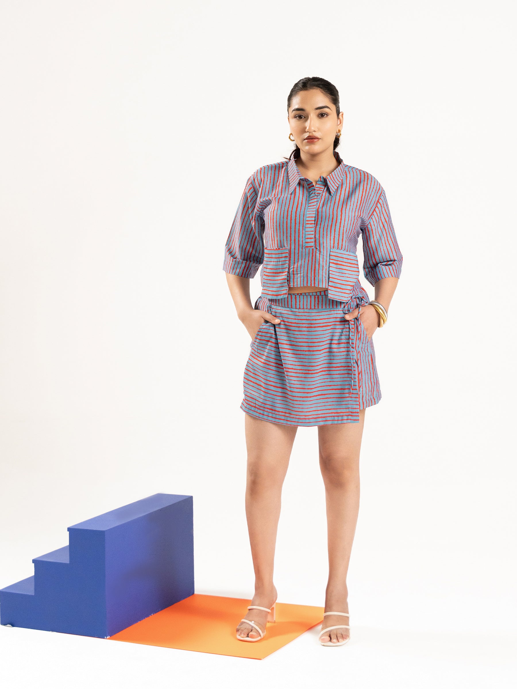Featuring a bold vertical-and-horizontal stripe pattern in electric sky blue and deep red, this two-piece set brings confident energy to any wardrobe. The boxy crop top is detailed with two exaggerated front pockets and a clean collar for a utility-chic feel, while the matching skort (yes, skirt + shorts!) adds unexpected ease and edge.This is the kind of look that takes you from day to night, city streets to gallery openings — all while keeping things cool, comfortable, and effortlessly put-together.