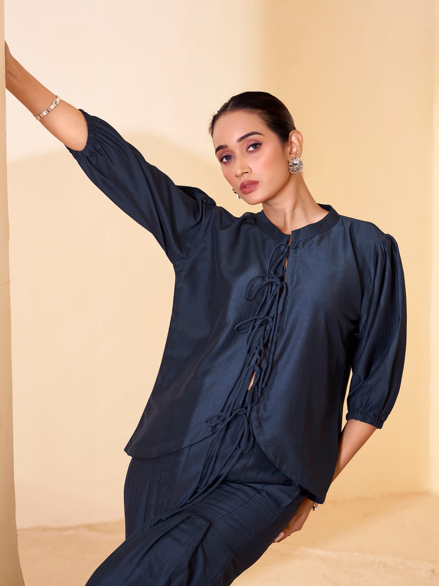 making it perfect for workdays and casual outings alike. The top features stylish puff sleeves and a flattering fit, while the pleated wide-leg trousers add movement and ease.