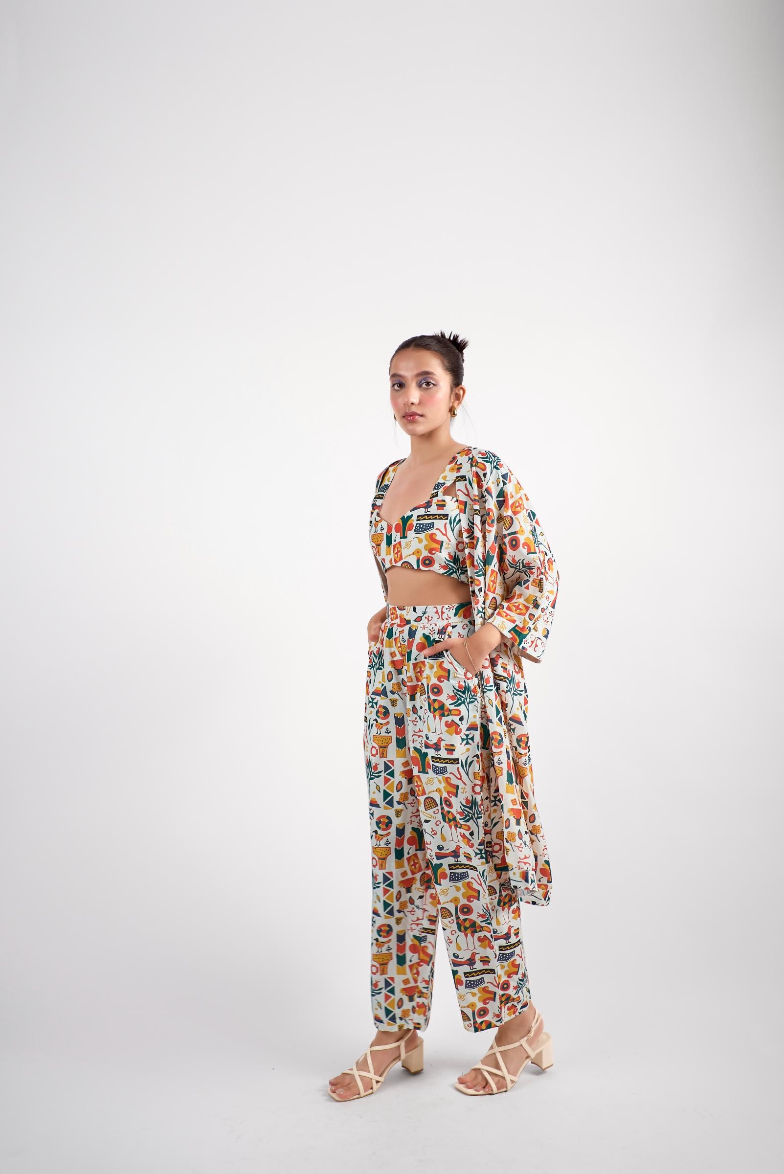 A refined three-piece co-ord ensemble, showcasing a plunging neckline bralette, a gracefully oversized jacket, and slip-on elasticated trousers with impeccably tailored front pockets, exuding effortless sophistication and modern elegance.