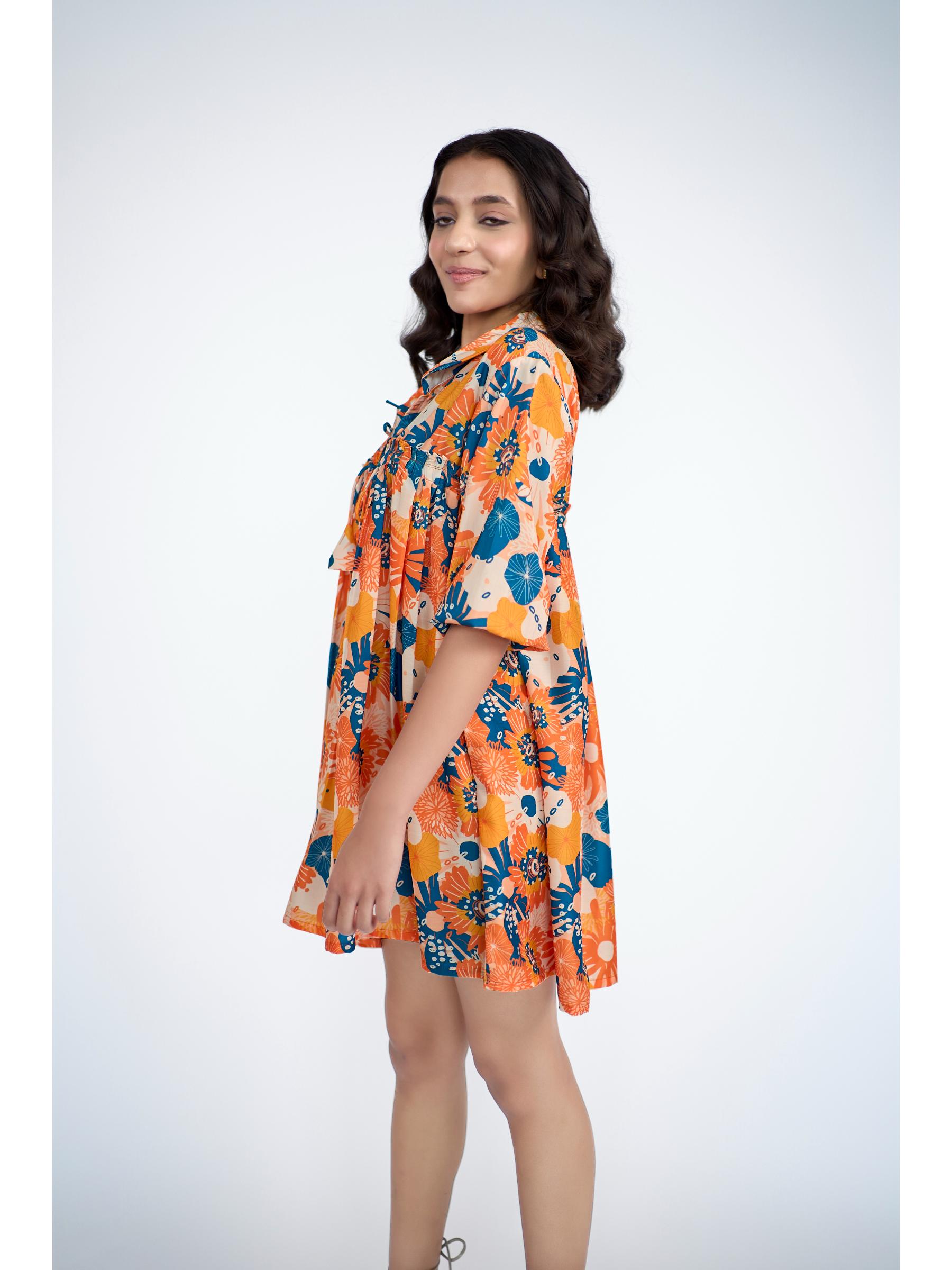 A flared printed dress with dramatic elbow-length balloon sleeves, adorned with a meticulously crafted drawstring detail at the chest for a perfect, tailored fit. The front button opening adds a touch of classic charm, elevating the design with an aura of effortless elegance.