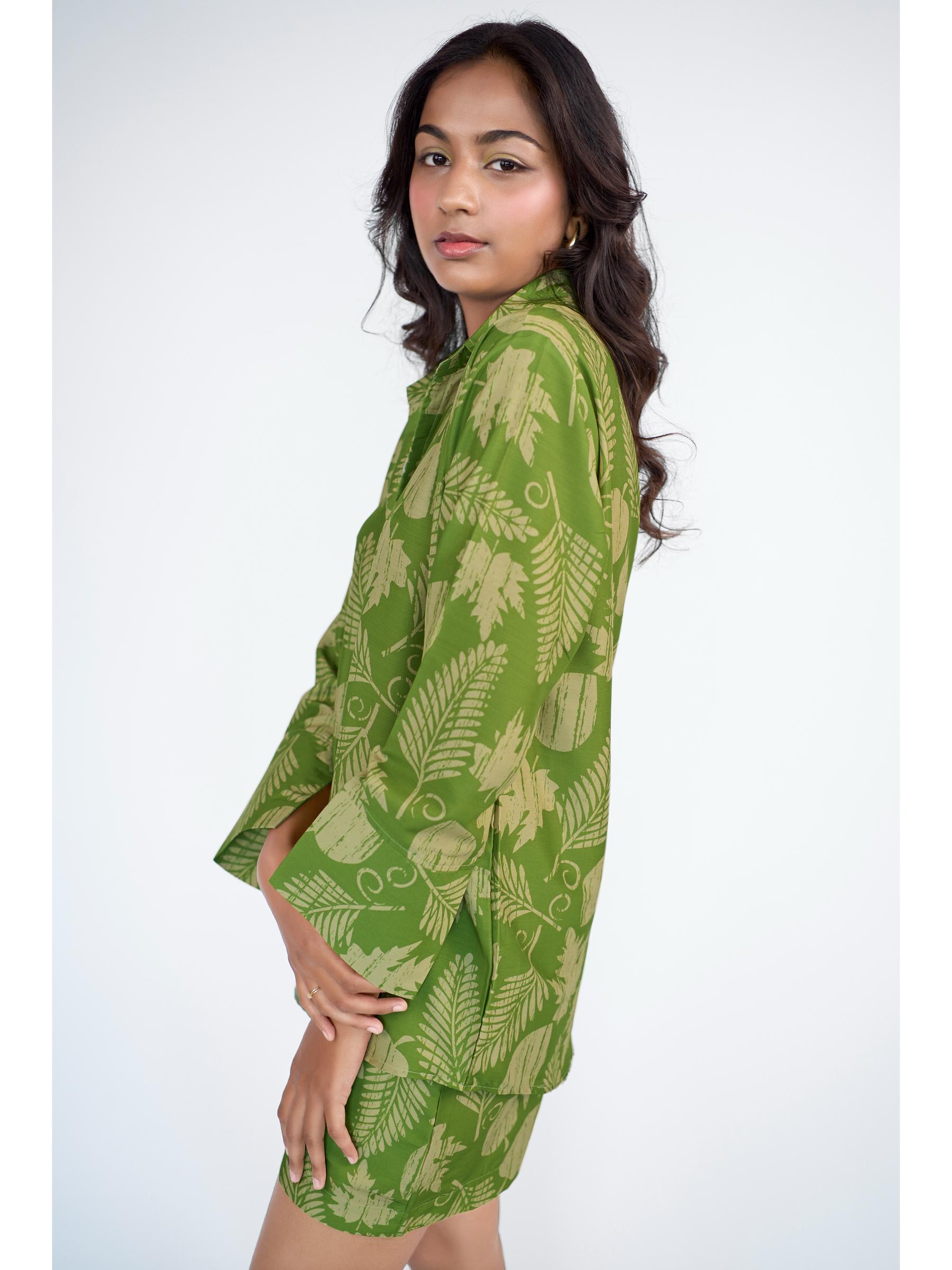 A green oversized collared shirt, designed with a refined drawstring detail at the front opening and elegant slit cuffs, paired with impeccably tailored shorts with pockets for a comfortable and contemporary look.