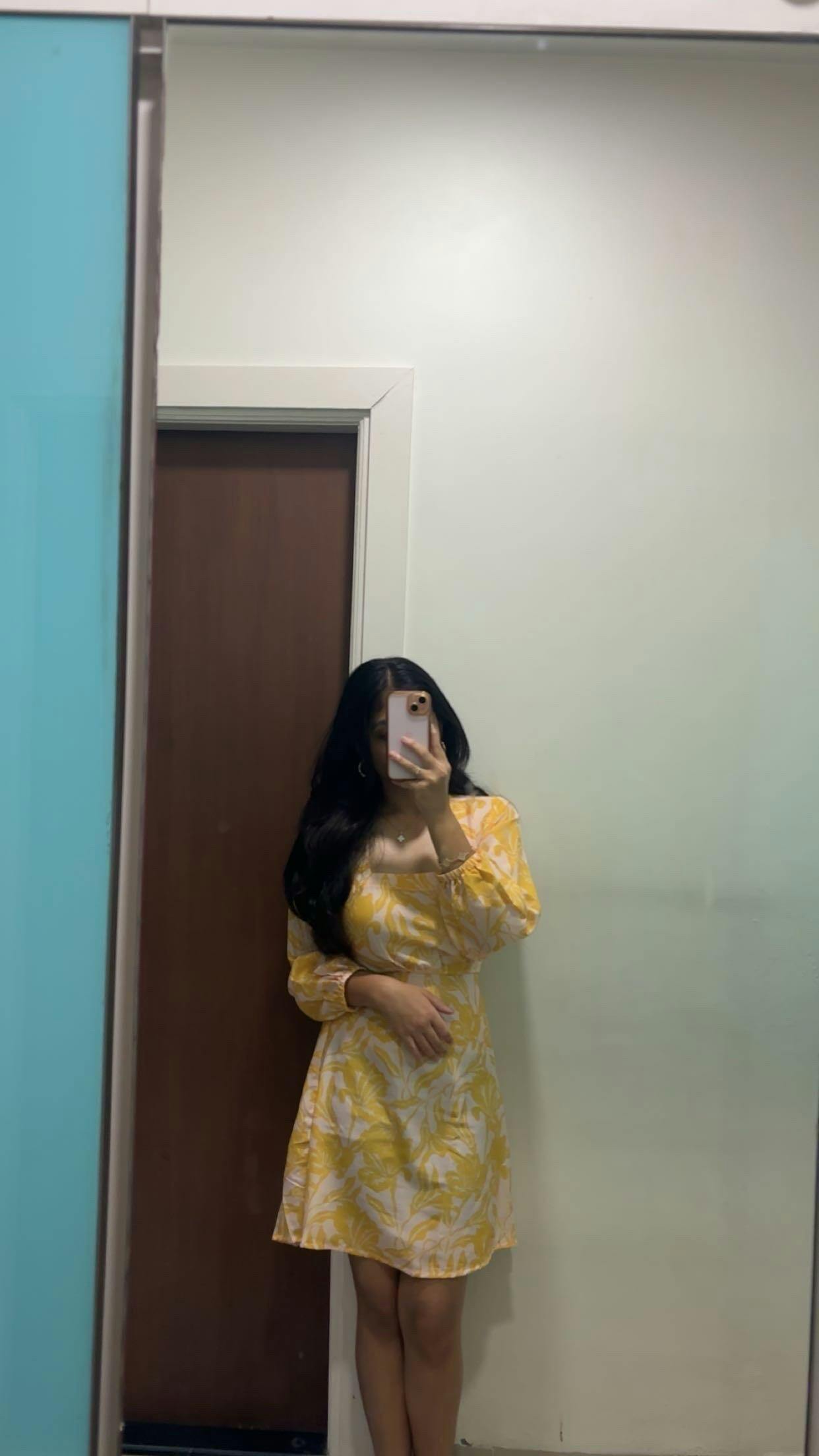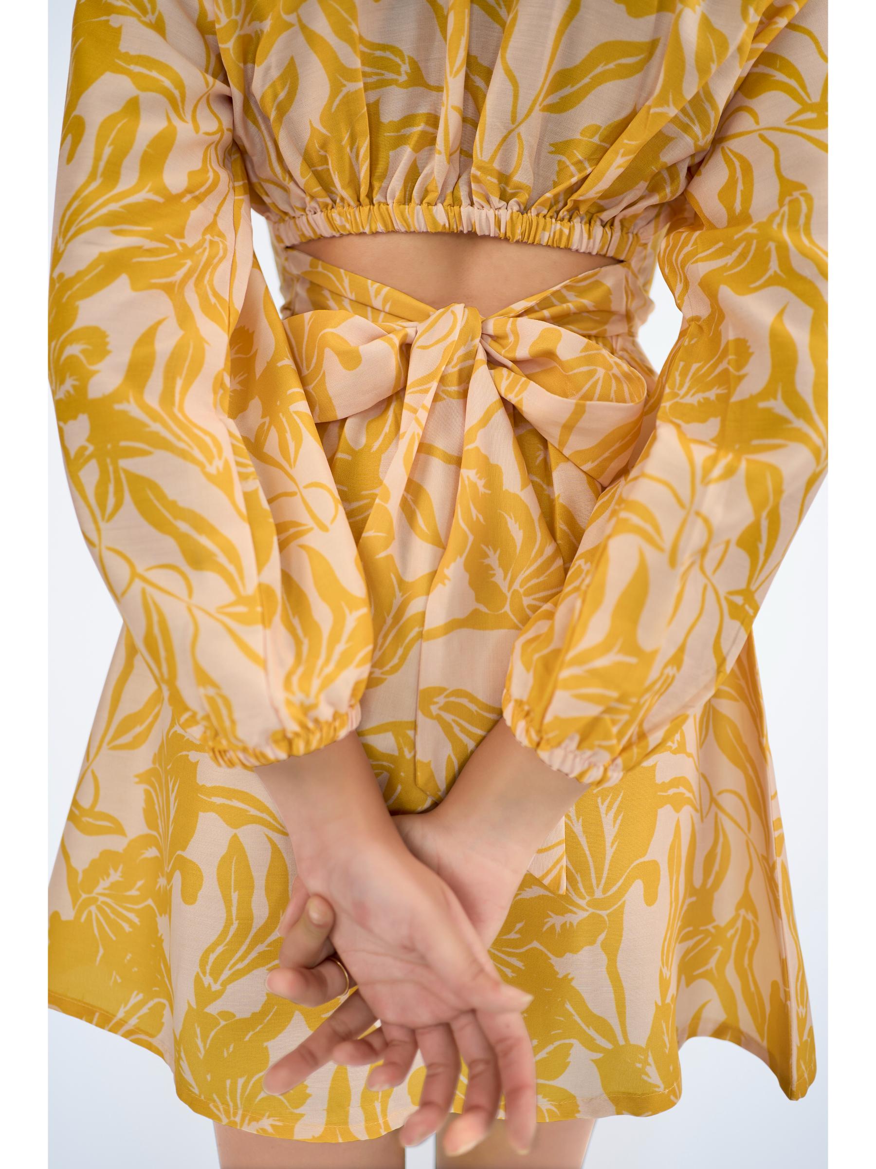 A mini dress with a striking square neckline, balloon sleeves, and an alluring back cut-out, elegantly accented with a delicate tie-up detail, exuding contemporary glamour and refined allure.