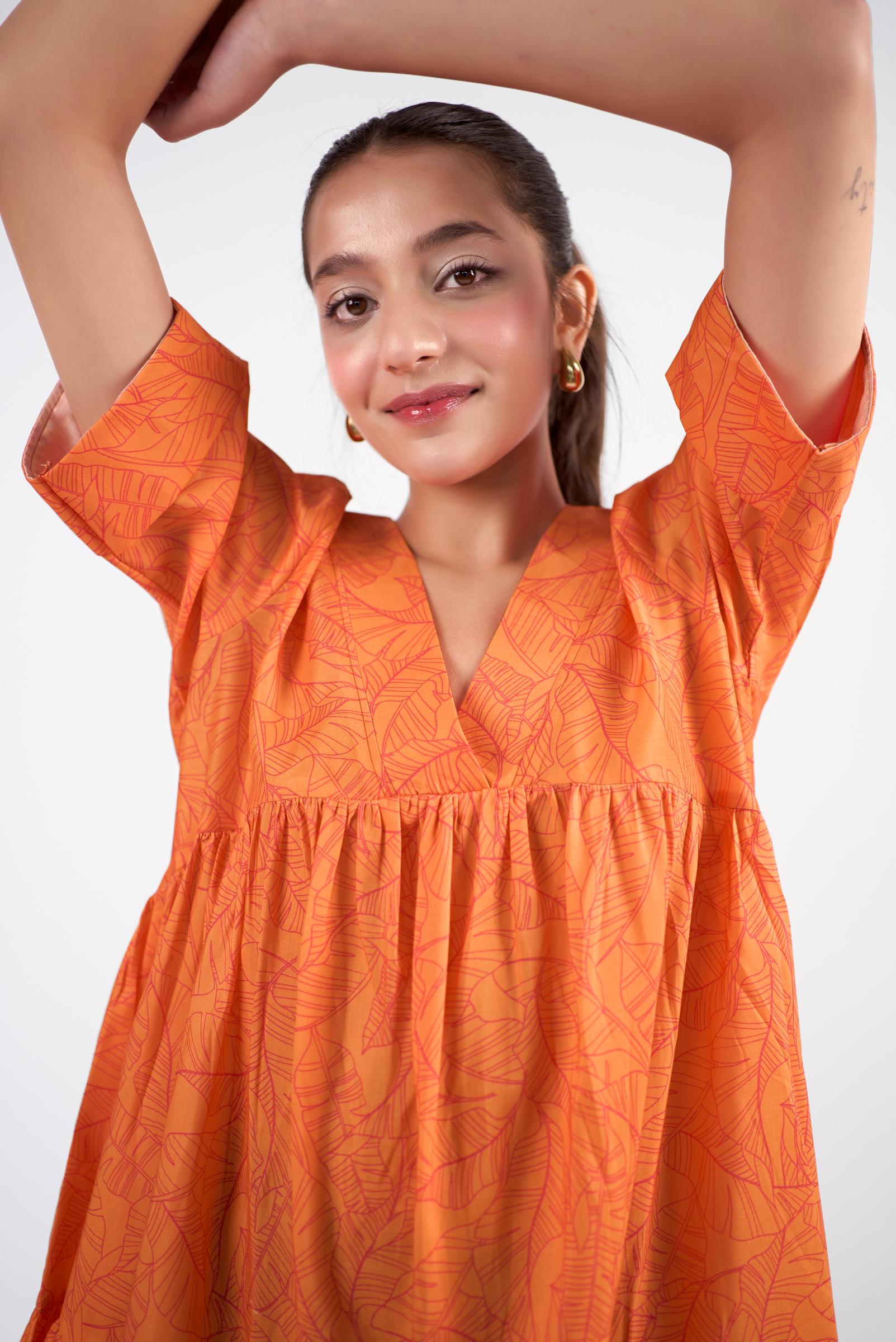And then, the dress itself! A vibrant tangerine canvas adorned with delicate crimson leaves, tiered and flowy—it felt like wearing sunshine. Perfect for the season and for when you want to feel effortlessly graceful.